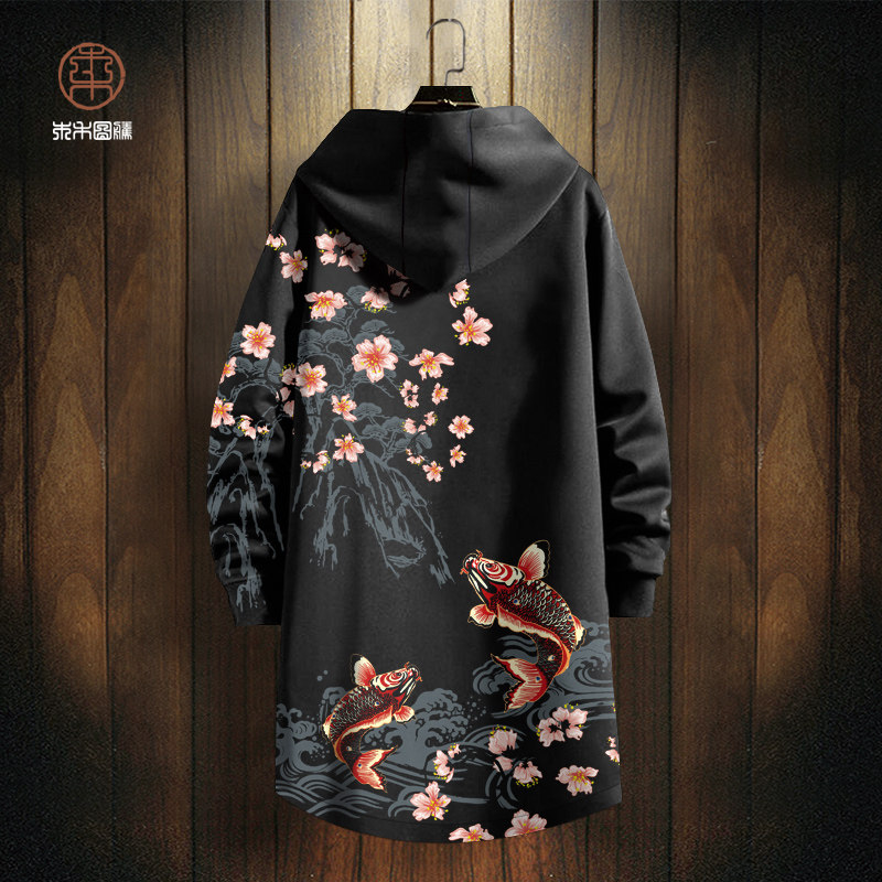 连帽风衣外套男oversize锦鲤印花中长款冬季新款花图案开衫厚大衣