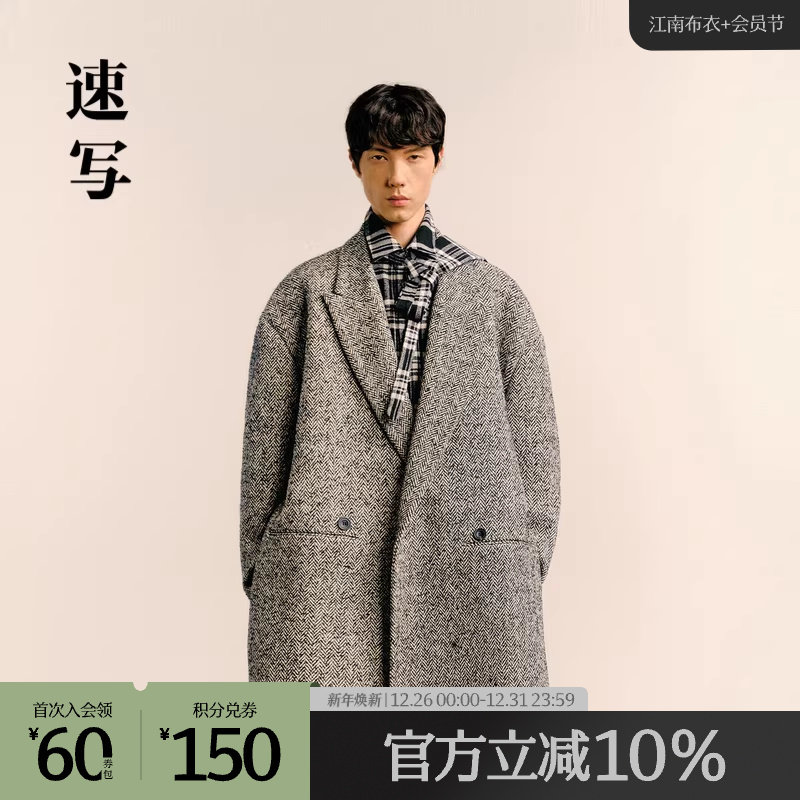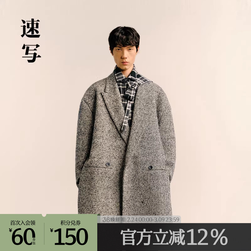 速写男装奥莱outlets男士大衣OVERSIZE毛呢外套戗驳领长款复古