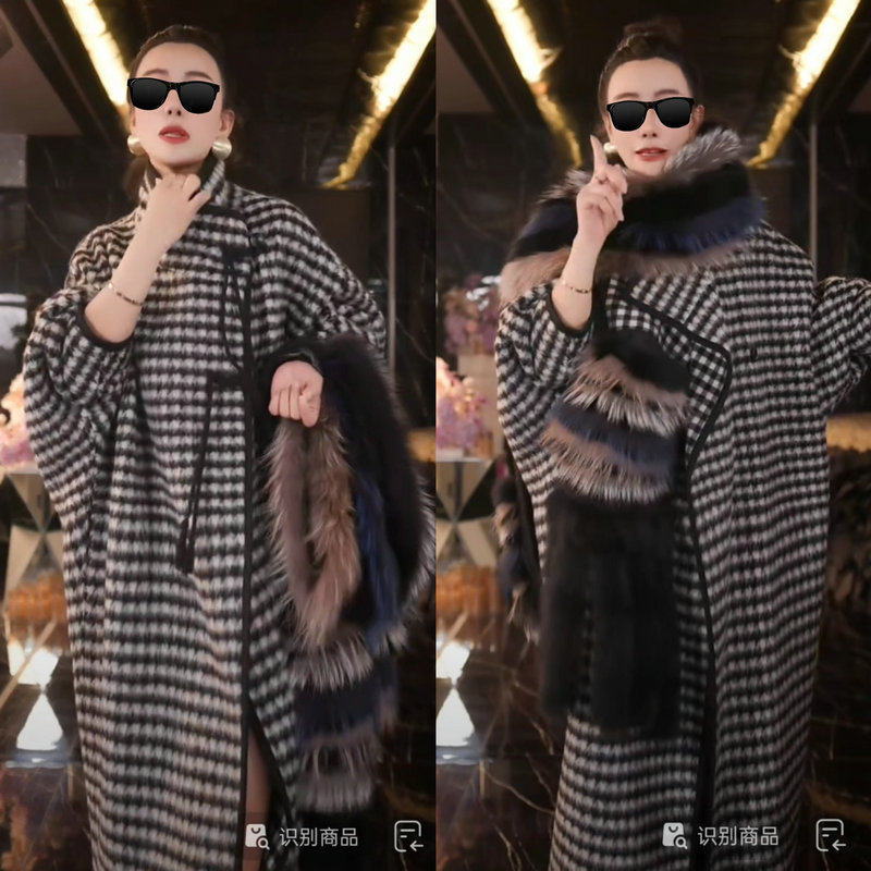 女神时尚高级千鸟格宽松oversize毛呢大衣狐狸毛大毛领遮肉大衣潮