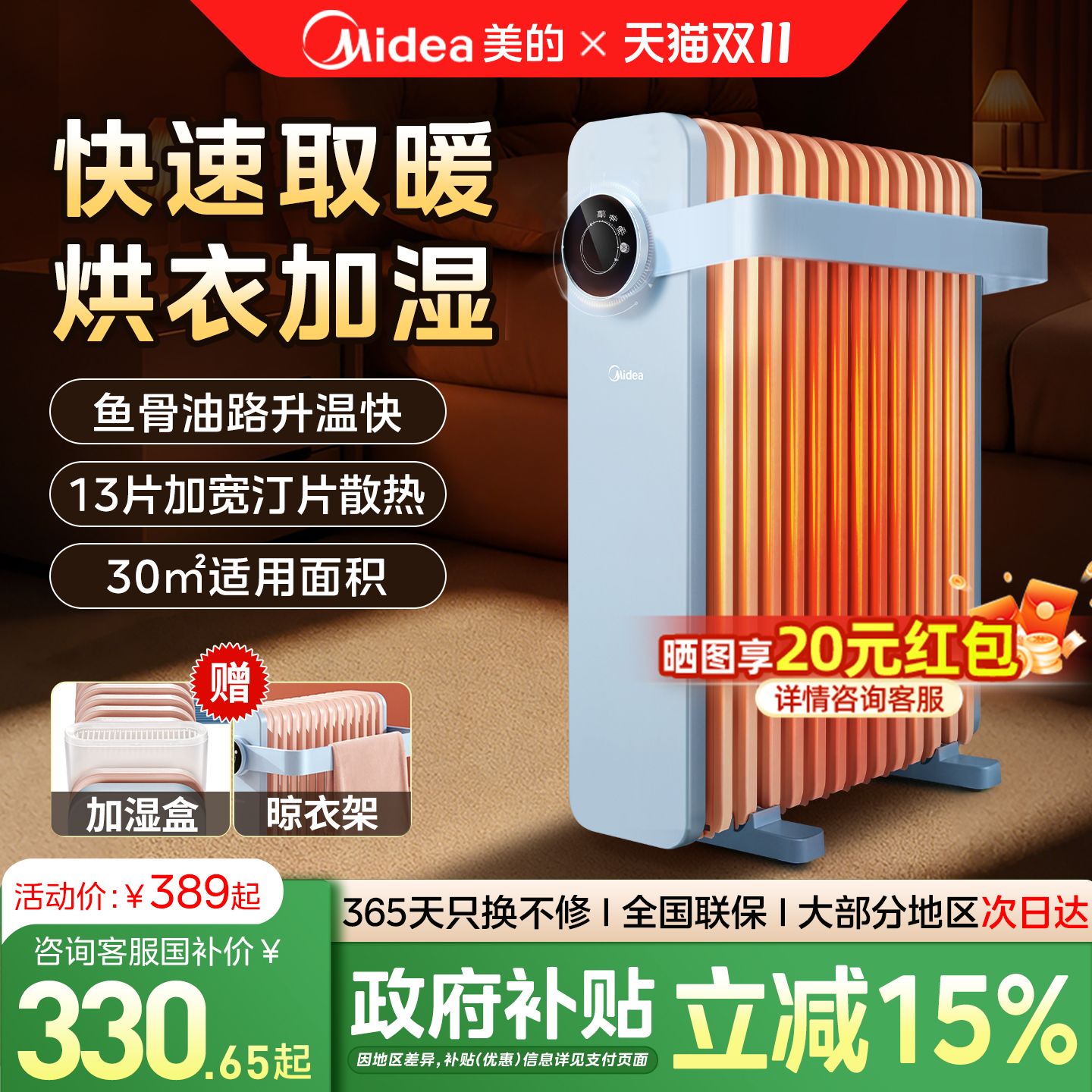 美的取暖器电油汀加宽全包防烫家用节能速热电暖气晾衣加湿电暖器