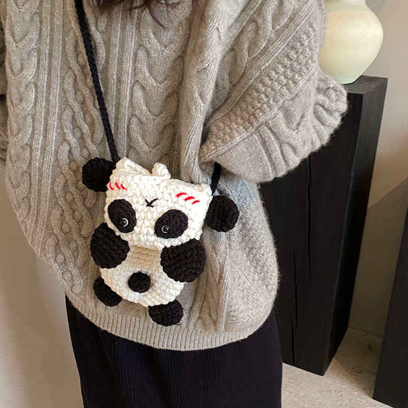 熊猫手机包成品钩织百搭毛线小包包可爱亲子包包手工编制斜挎包潮