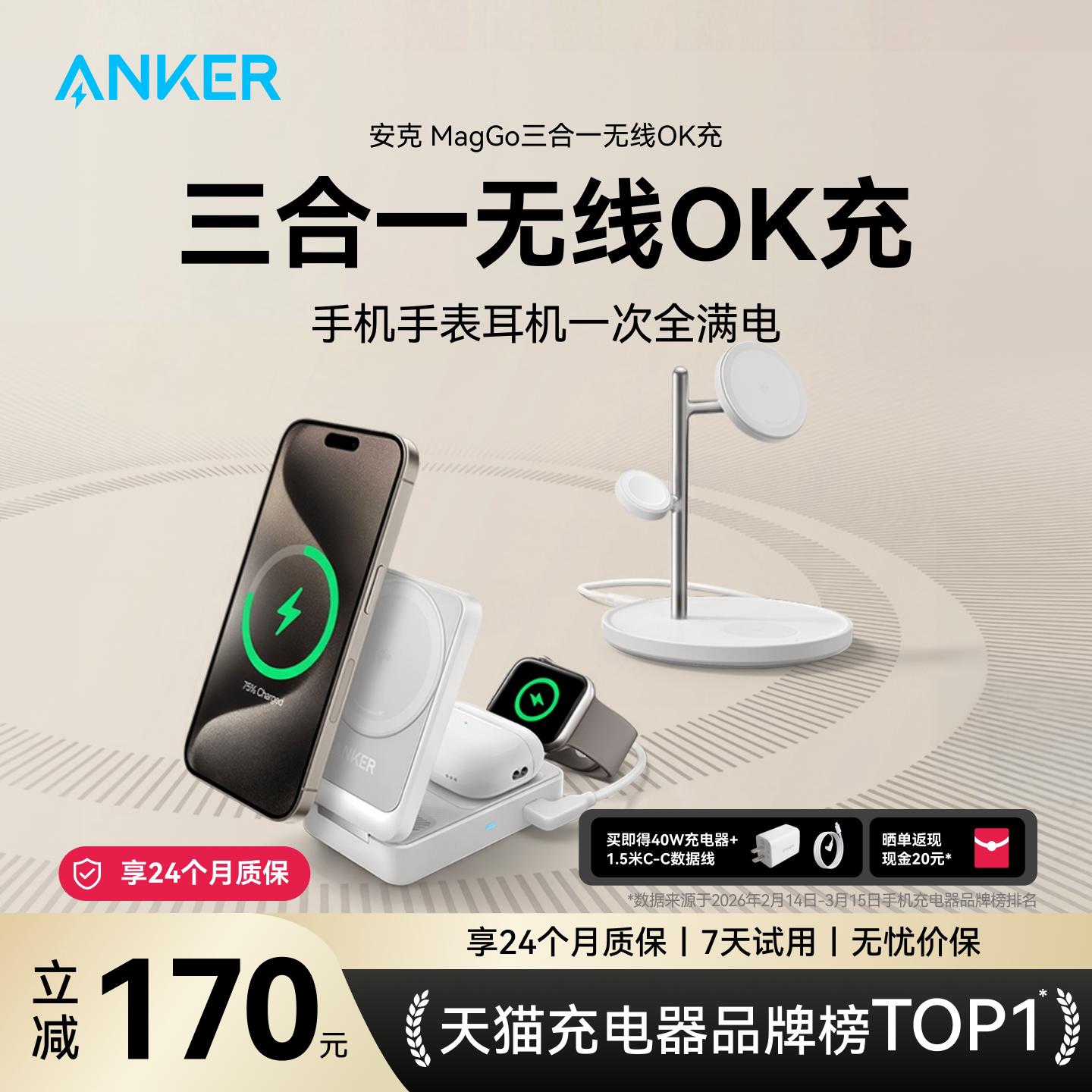 Anker安克MagGo15W磁吸三合一无线充电器折叠支架OK充认证适用iPhone17苹果17/16/15充电头手表充电座