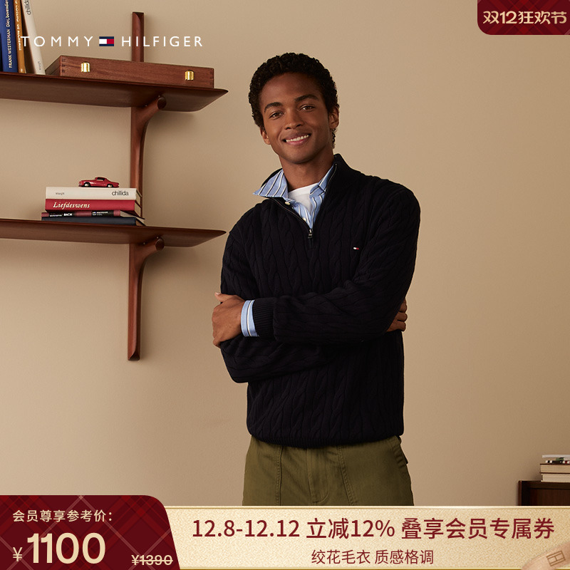 Tommy26早春新款男纯棉休闲半拉链小高领绞花纯色内搭打底针织衫