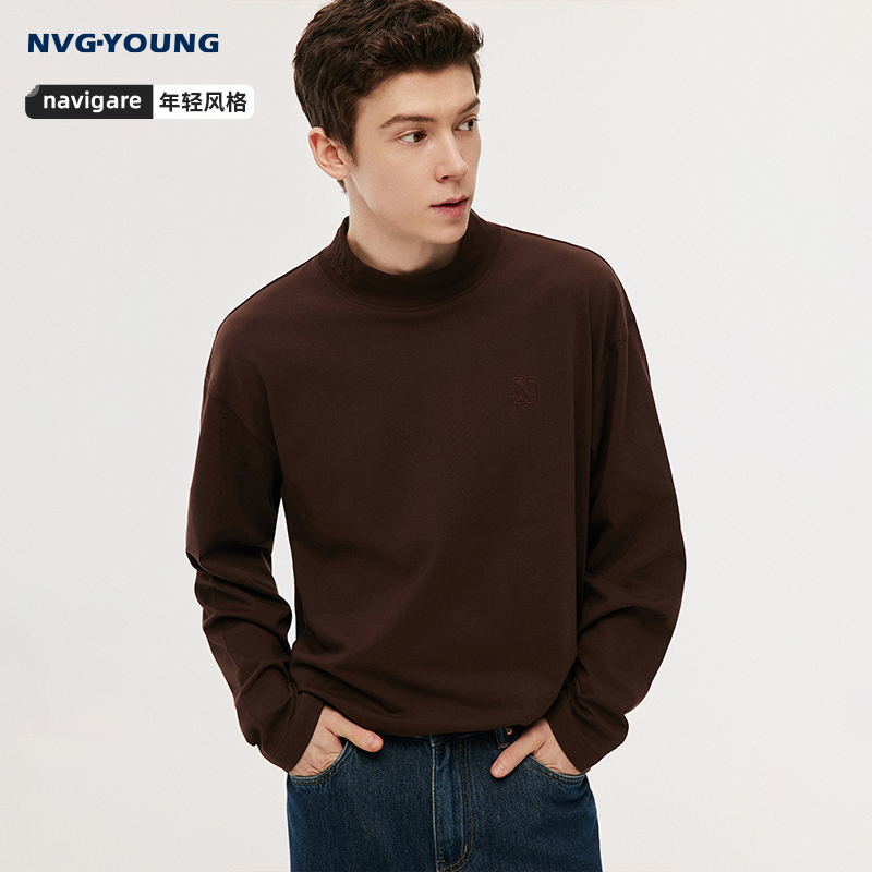 海上公路小烫标长袖T恤男士秋季微修身半高领保暖休闲内搭打底衫