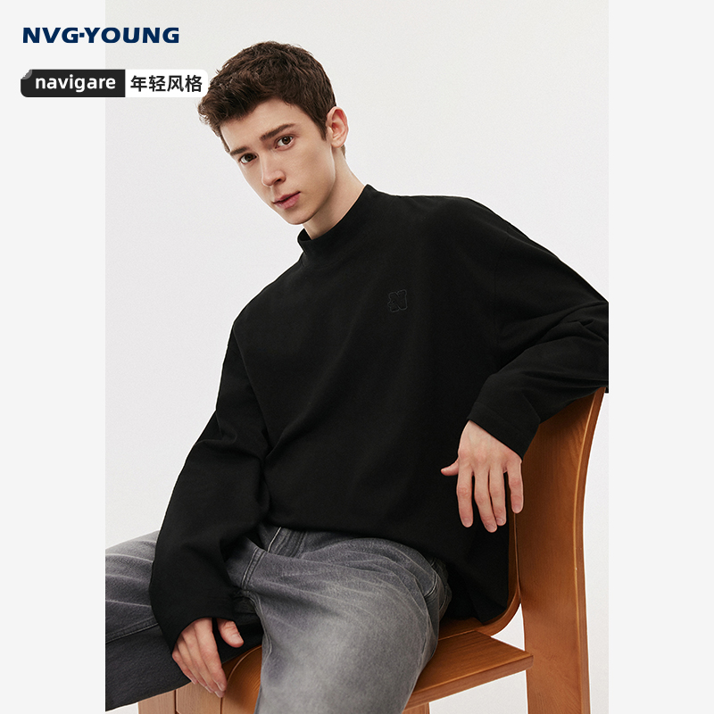 [纯棉]NAVIGARE意大利小帆船黑色休闲卫衣男秋半高领打底套头衫