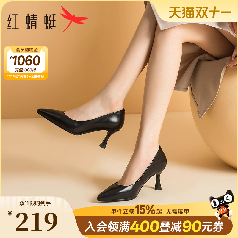 红蜻蜓黑色高跟鞋女职业皮鞋秋季细跟女鞋子尖头法式通勤气质单鞋
