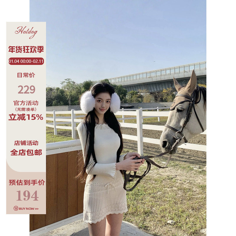 Hotdog 热狗很辣【浪漫时分】 裸灰色极简气质长袖花边针织连衣裙