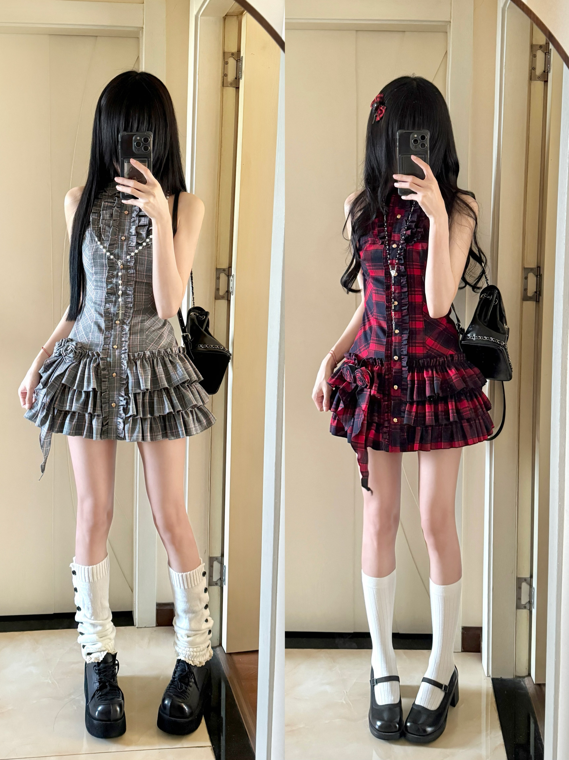 茉莉白jasmine原创设计古早格子连衣裙 灰粉格 红黑格 --低腰版