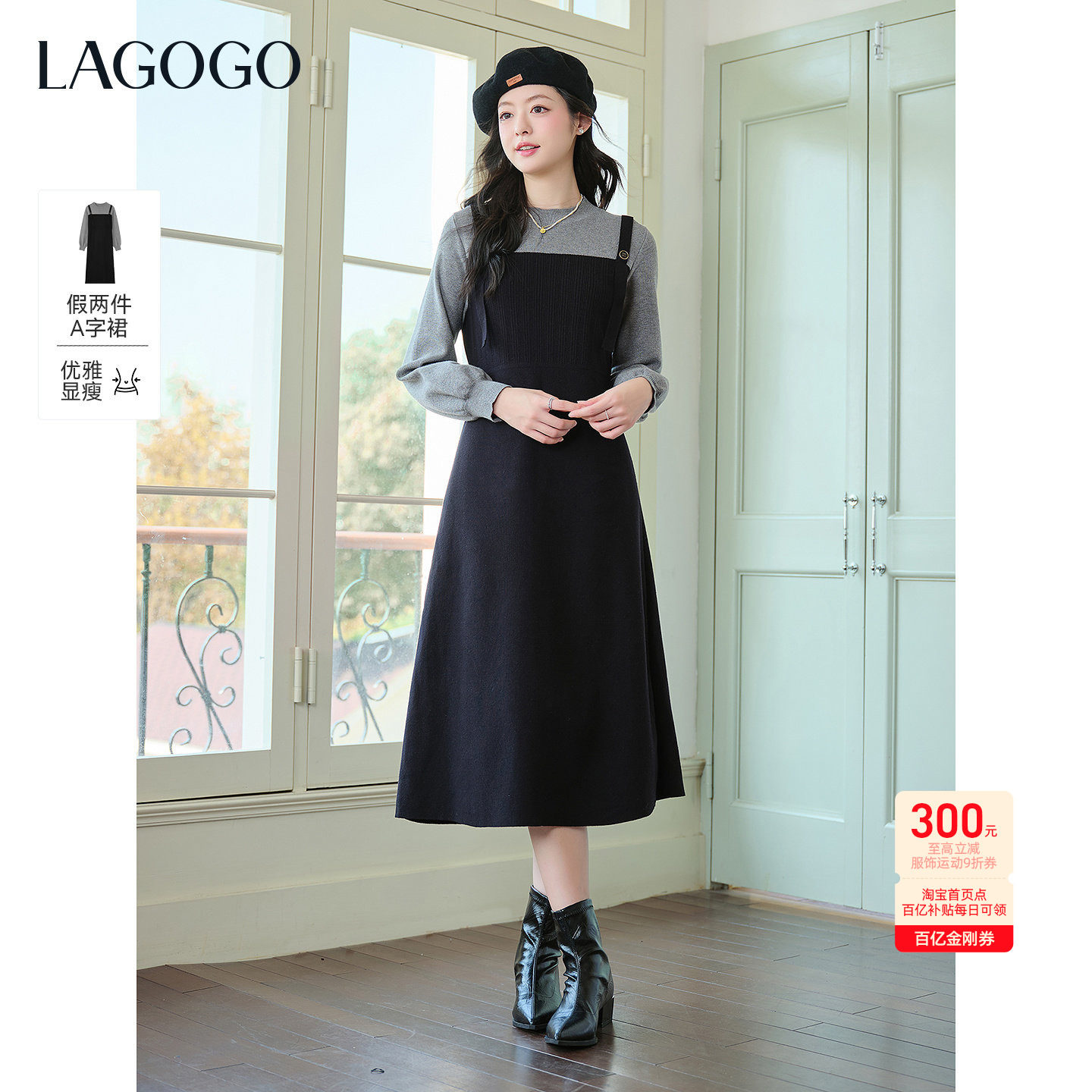LAGOGO灰影叠梦拼接针织连衣裙女拉谷谷2025冬新款假两件优雅裙子