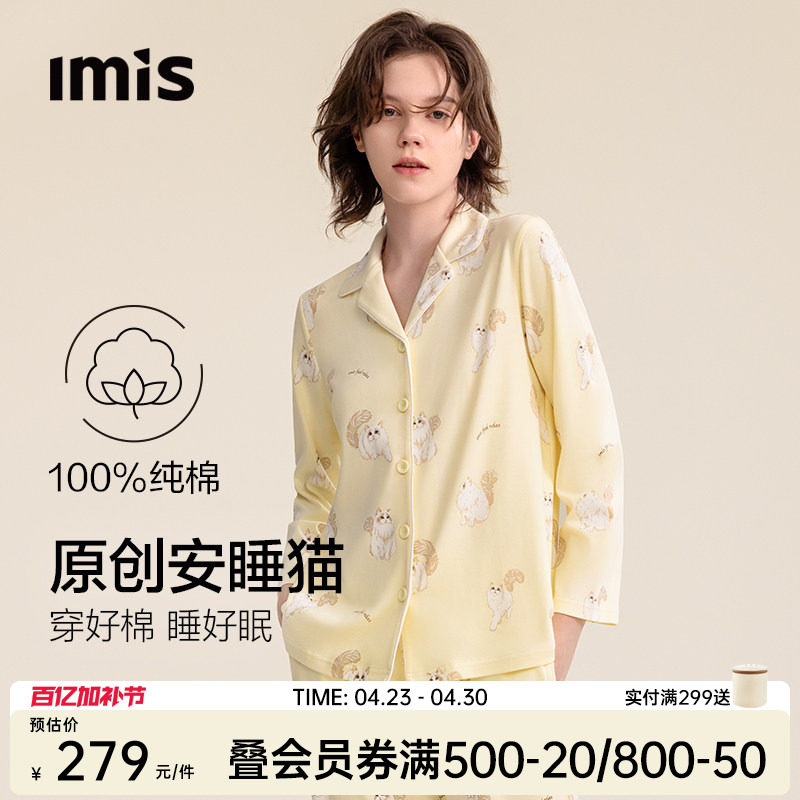 爱美丽安睡猫双面布纯棉睡衣女士翻领春秋新款长袖长裤家居服套装