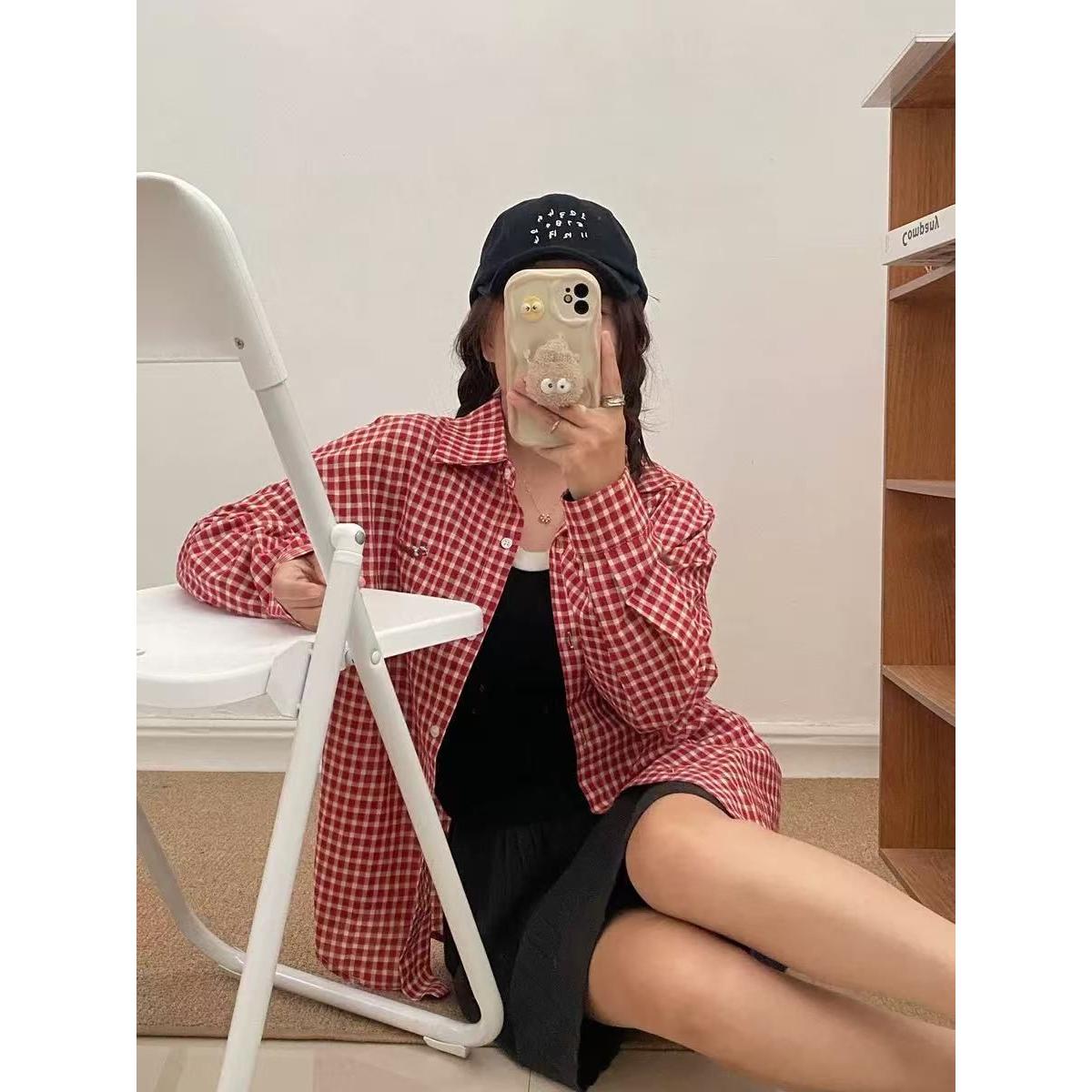 2025秋季红白格子衬衫外套女中长款松弛感外搭开衫休闲罩衫防晒衣