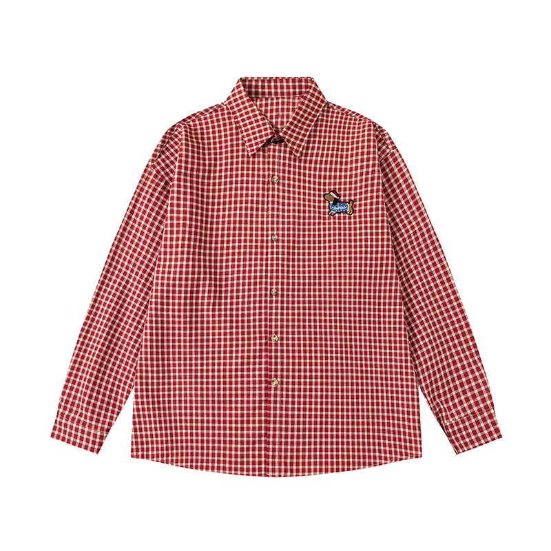 腊肠小狗刺绣红白格纹衬衫男女2025秋季港风格子衬衣情侣开衫外套