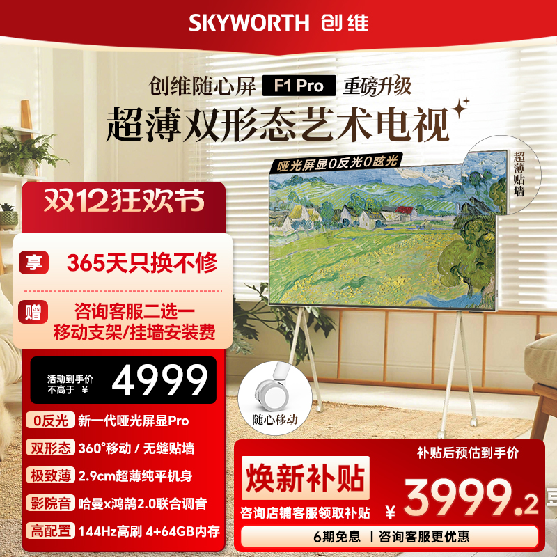 创维随心屏F1 Pro 55英寸壁纸艺术画壁电视 可移动可超薄无缝贴墙