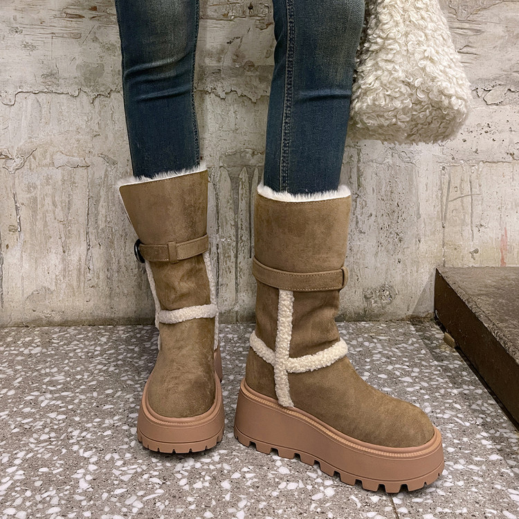 厚底防滑磨砂高靴女真皮冬季加绒中筒靴坡跟雪地靴保暖棉鞋马丁靴