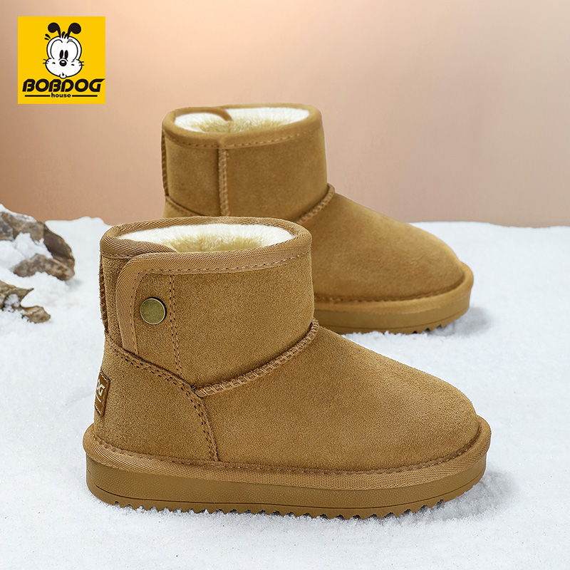 巴布豆儿童雪地靴真皮毛一体女童鞋子冬季中筒加绒保暖男童棉短靴
