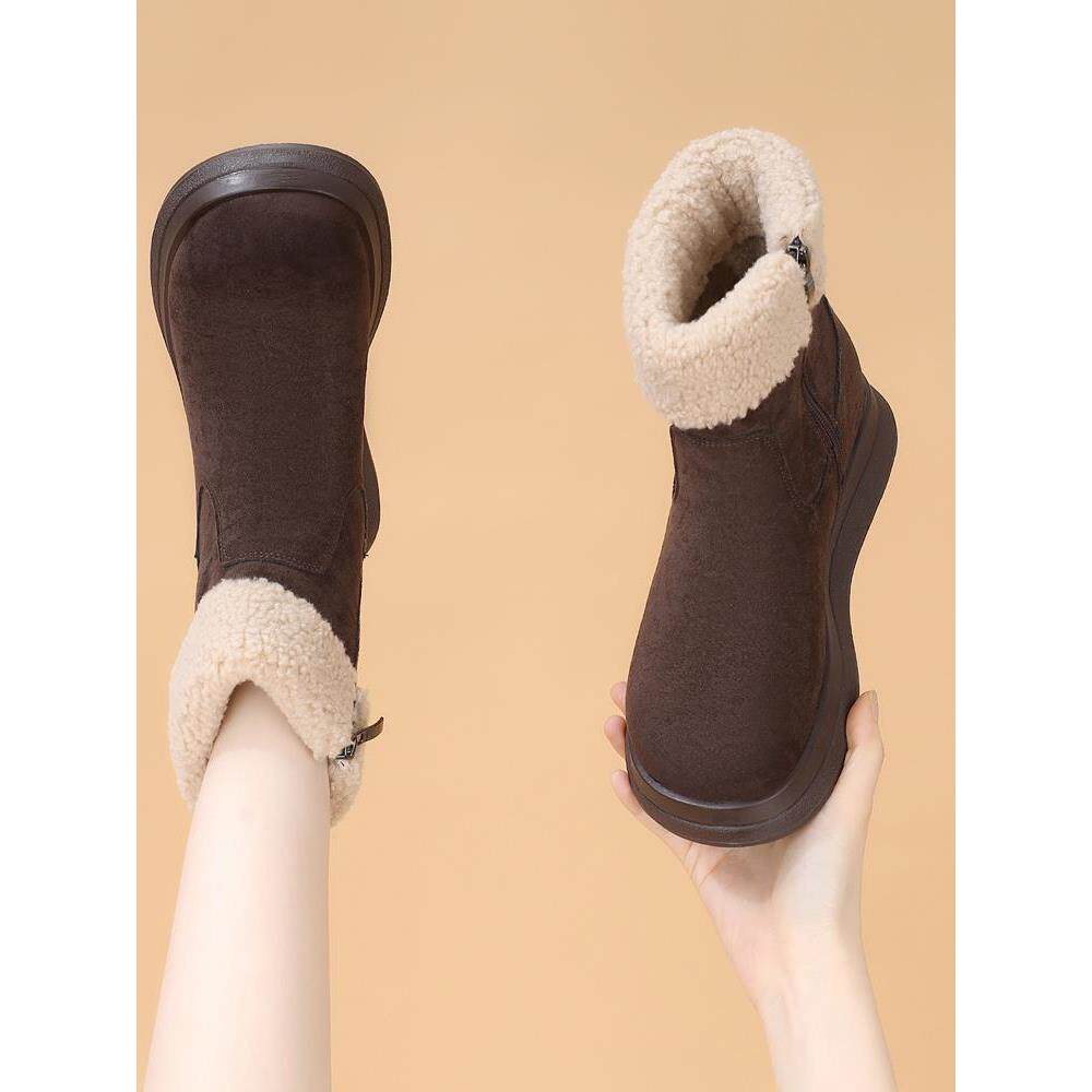 保暖翻口加绒厚底中筒雪地靴女增高2025冬季新款真皮毛毛加厚棉鞋