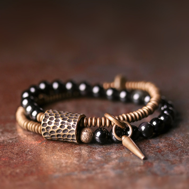 曲尾花复古黑曜石混搭铜珠子串珠多层手链女个性百搭手串男手饰品