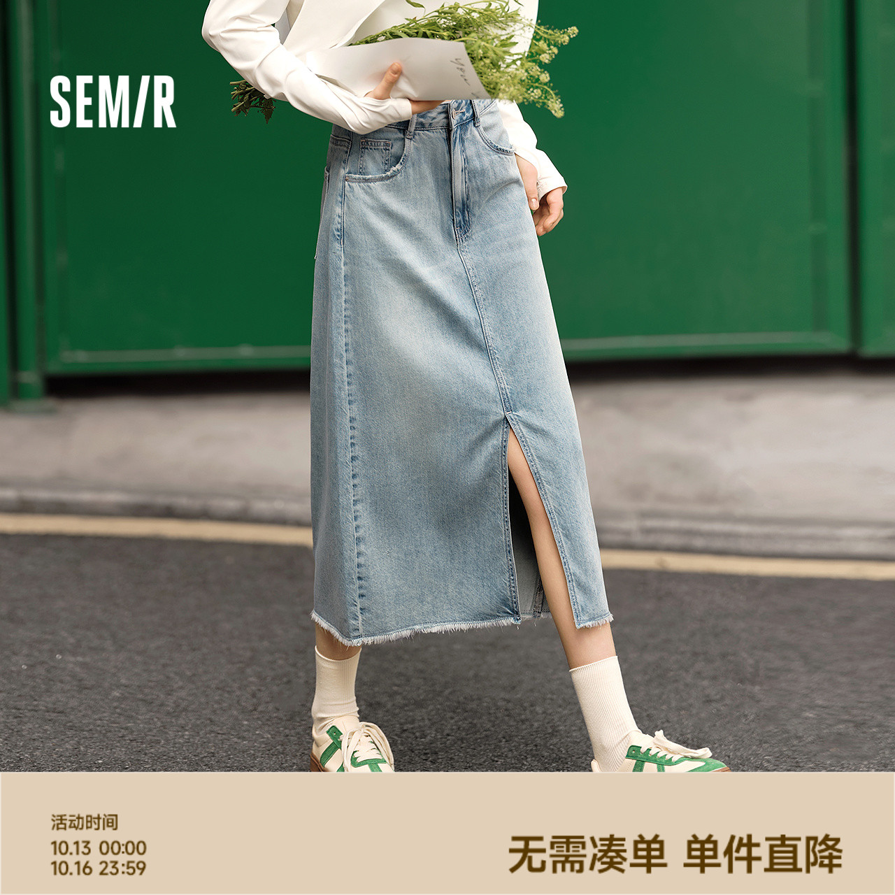 森柔牛仔|森马牛仔半身裙女毛边潮流夏季显瘦复古开叉直筒裙个性