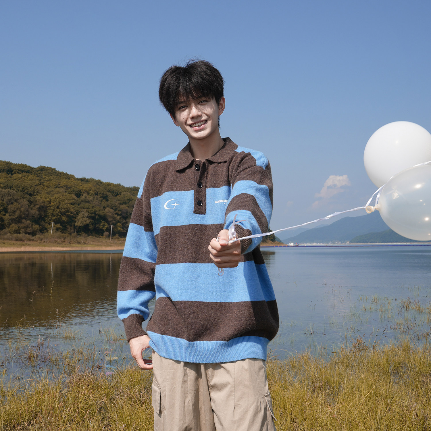 GOGOSOON宽条纹polo领毛衣男2025新款秋冬小兔纱内搭上衣个性印花