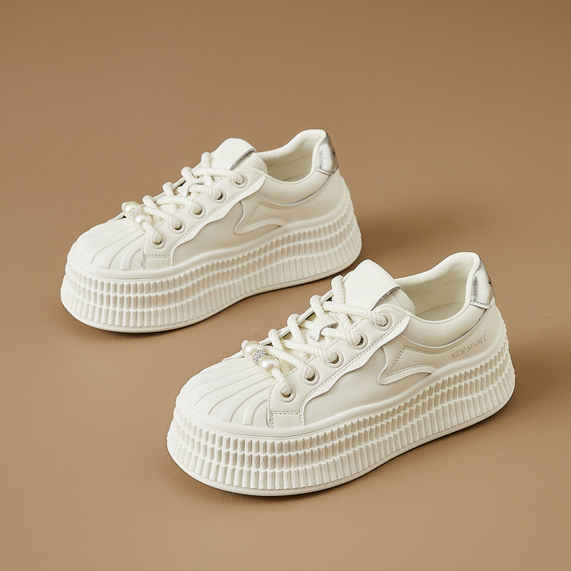 真皮版~韩版珠光米奇大头贝壳头小白鞋休闲板鞋面包鞋7cm松糕女鞋