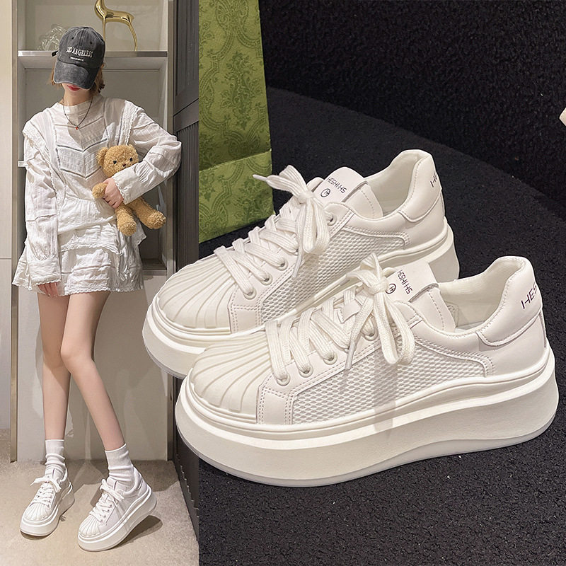 真皮贝壳头透气网面小白鞋女2026夏新款韩版厚底增高系带饼干板鞋