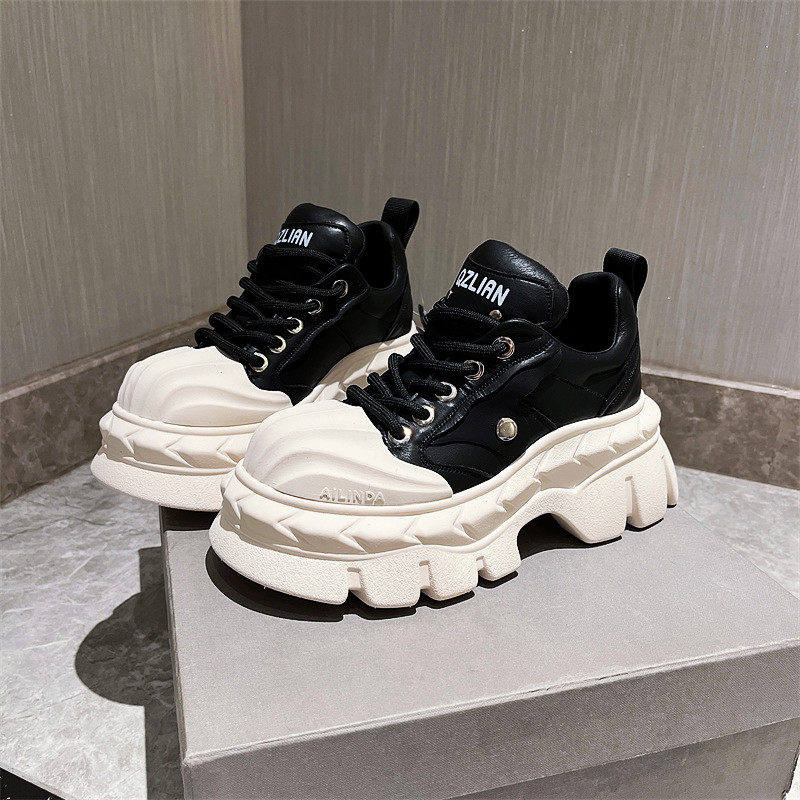 真皮版~韩版贝壳头系带厚底松糕休闲鞋面包鞋小白鞋7cm小个子女鞋
