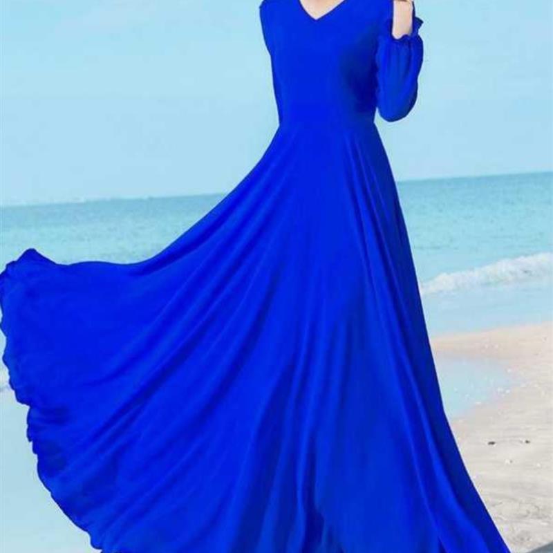 双层大下摆舞蹈长裙修身长袖雪纺连衣裙女士沙滩裙大号中长过膝裙