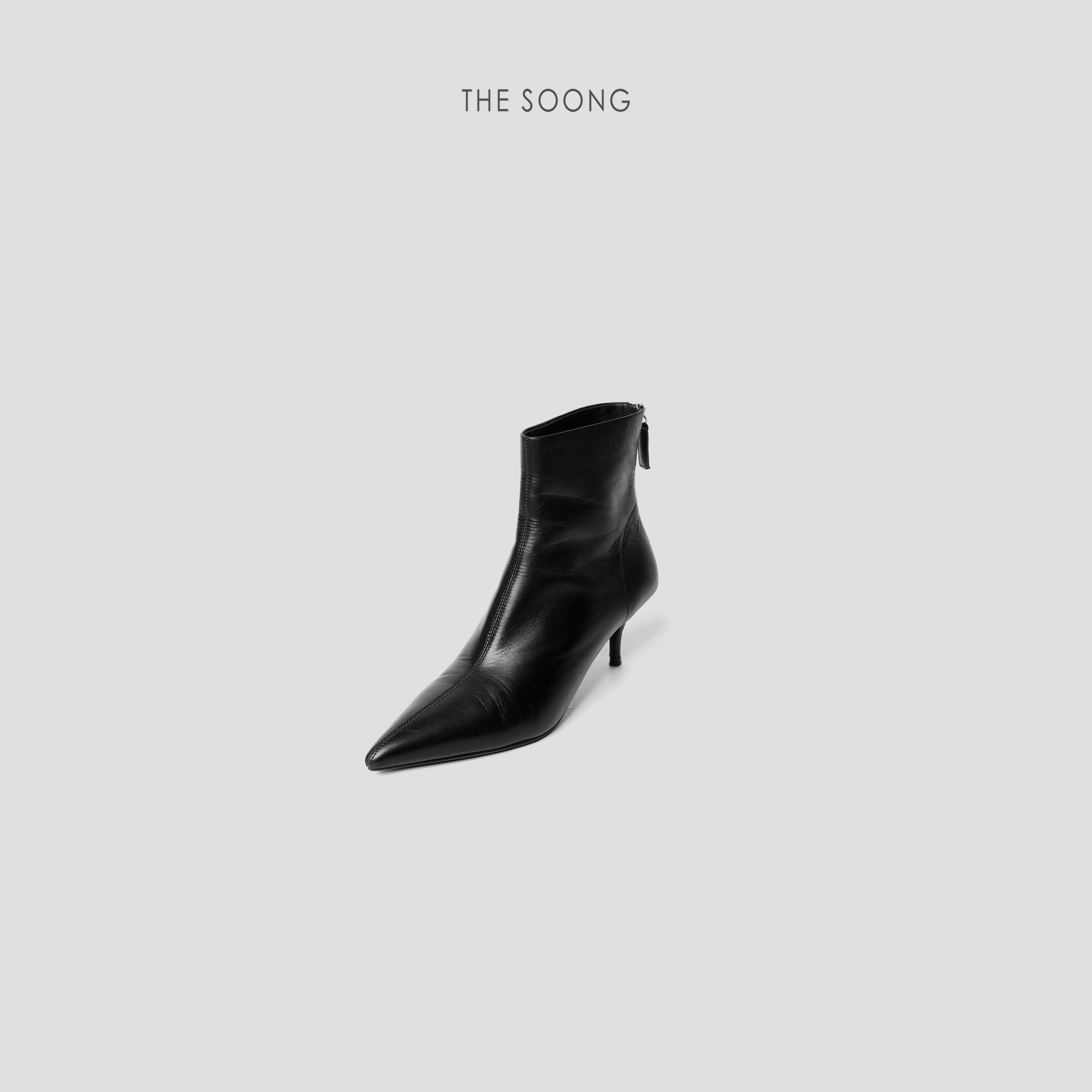 THESOONG/尖头瘦瘦靴 极简牛皮舒适光泽感细跟后拉链短靴6336