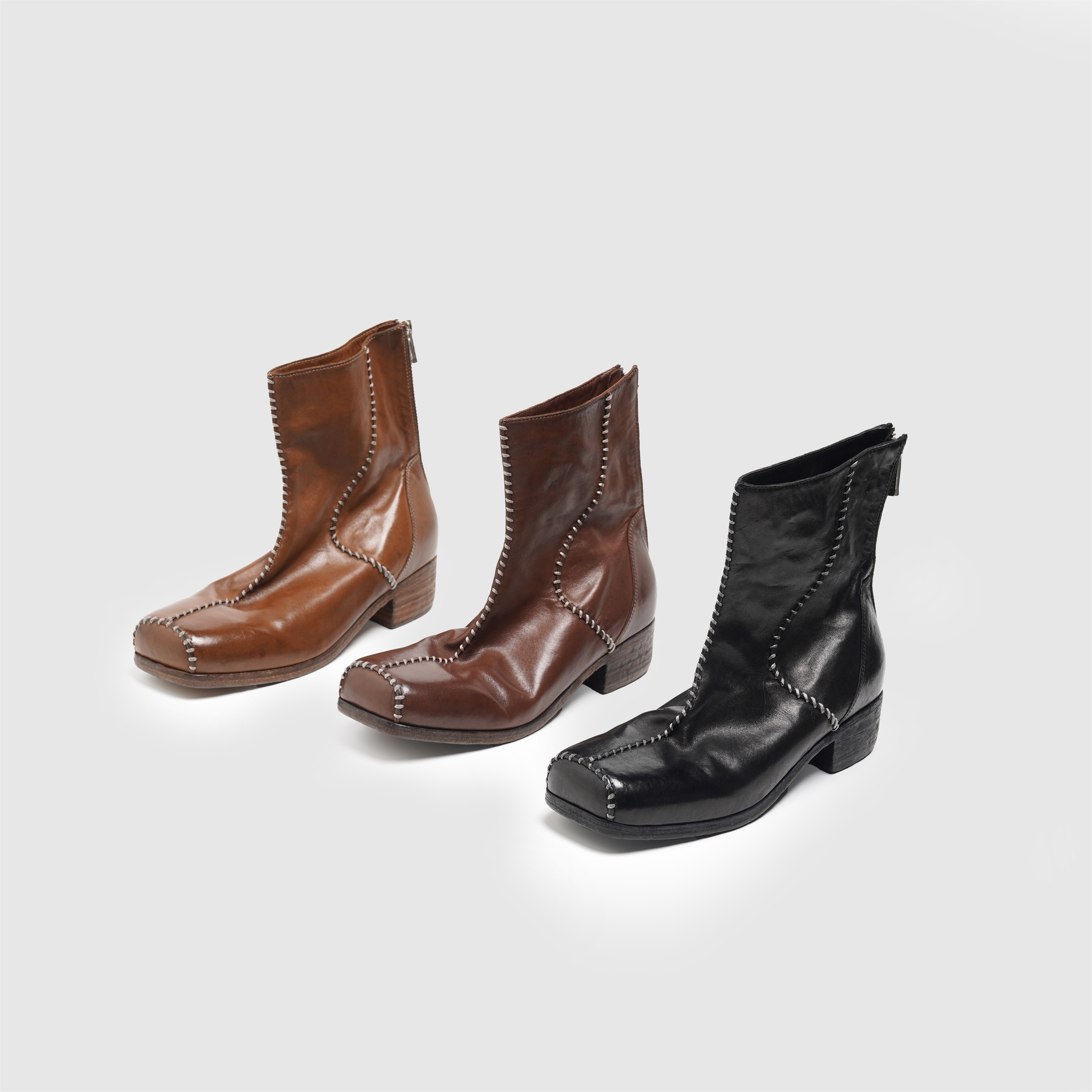 意大利进口马皮水洗做旧靴子女 手工马克缝线方头低跟后拉链短靴