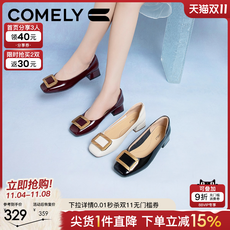 康莉商场新款粗跟单鞋女春秋上班通勤漆皮浅口方扣黑色真皮高跟鞋