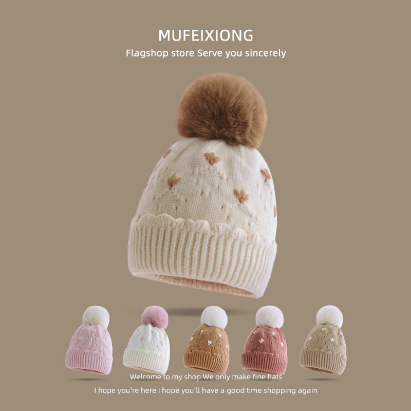 秋冬季儿童保暖帽子手钩提花大毛球加厚针织帽男女宝宝防寒毛线帽