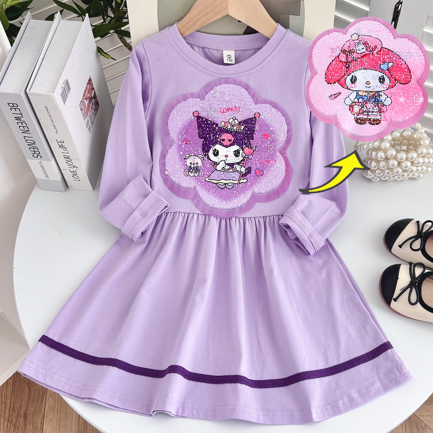 库洛米女童长袖连衣裙儿童秋季亮片变脸衣服女孩子纯棉裙子玉桂狗