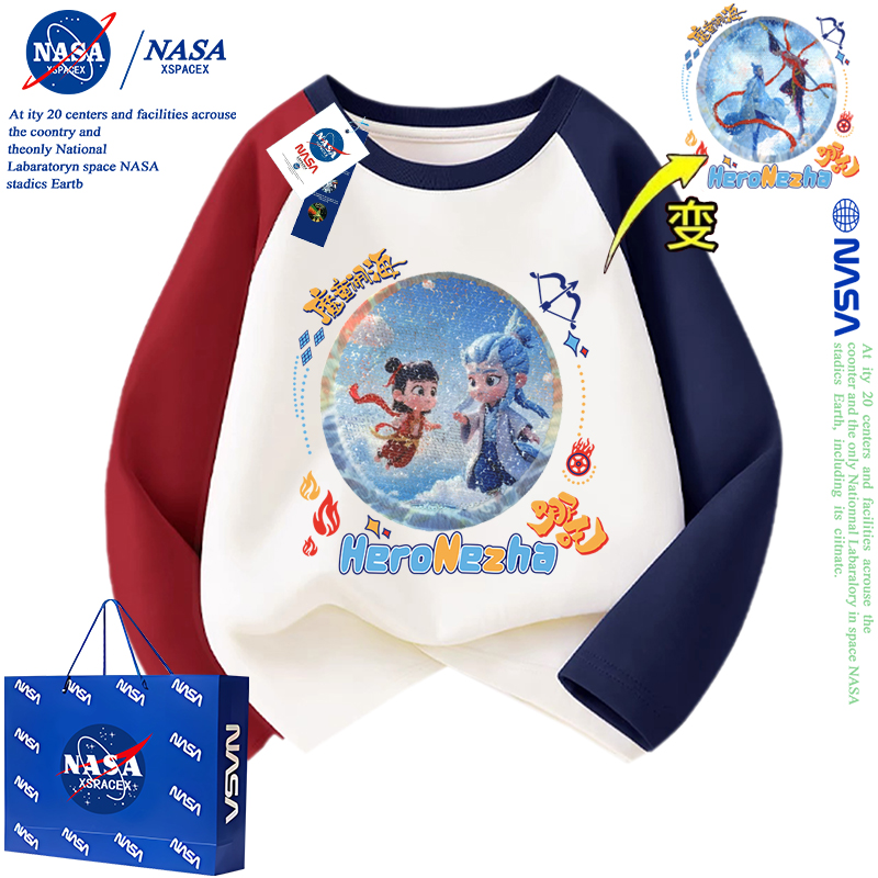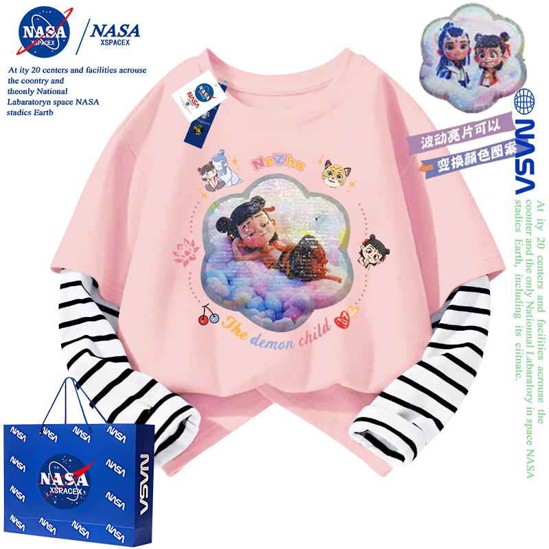 NASA联名女童哪吒敖闰亮片变脸衣服纯棉长袖T恤春秋女孩拼色上衣