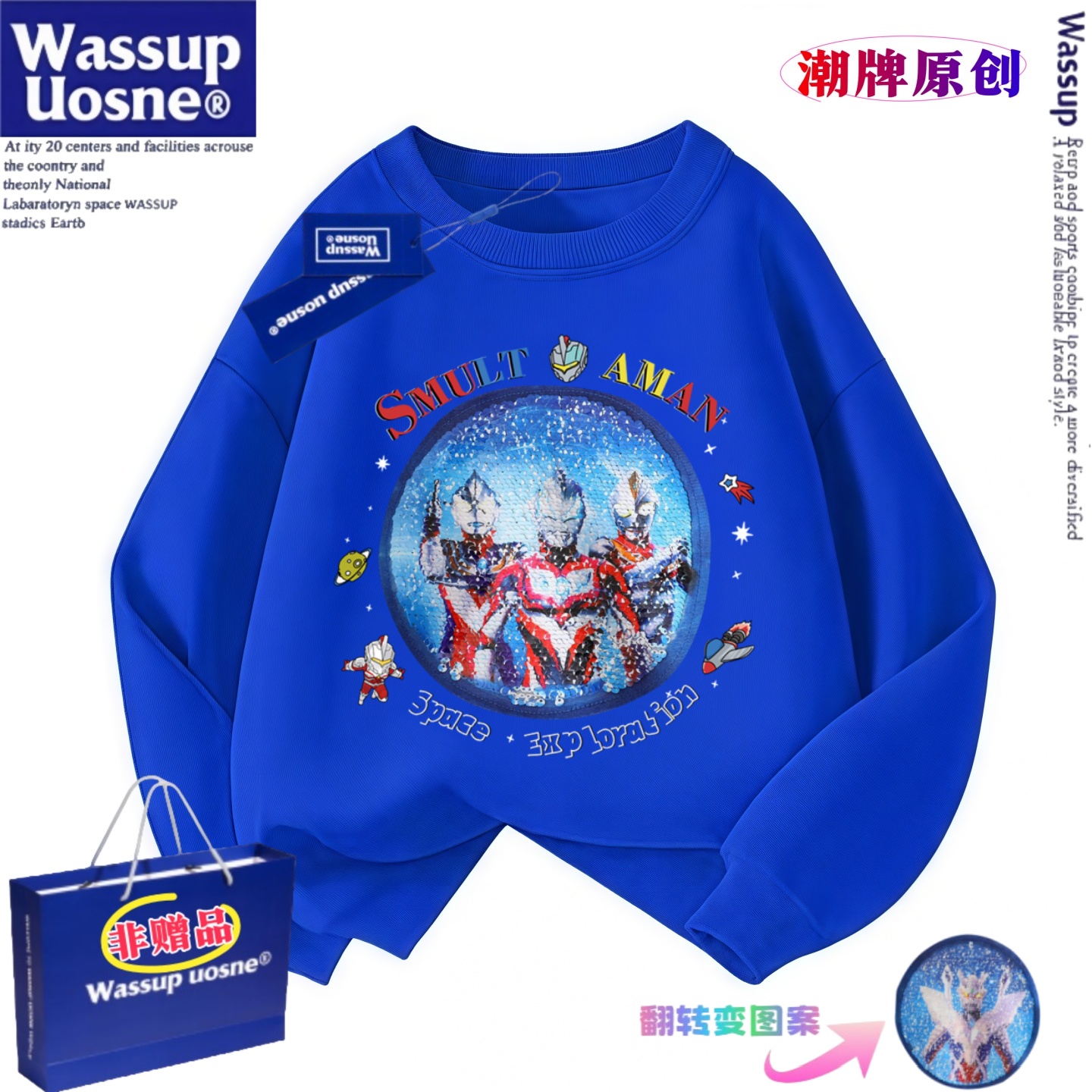 WASSUP联名男孩奥特曼亮片卫衣儿童迪迦赛罗变脸衣服男童秋冬上衣
