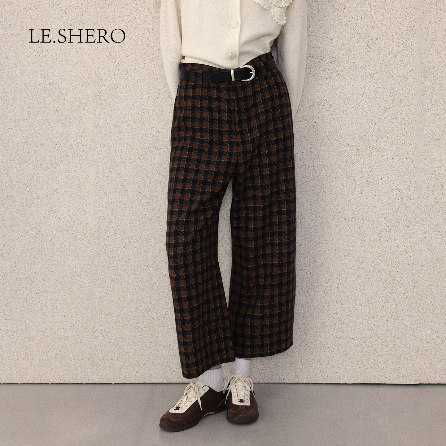 LE.SHERO原创设计显瘦复古羊毛格纹宽腿长裤女士百搭九分休闲裤