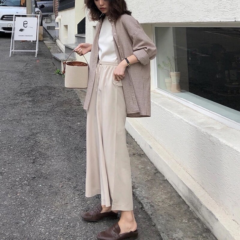园园美衣复古高密100%棉阔腿裤女松紧腰显瘦裙裤休闲宽腿裤九分裤