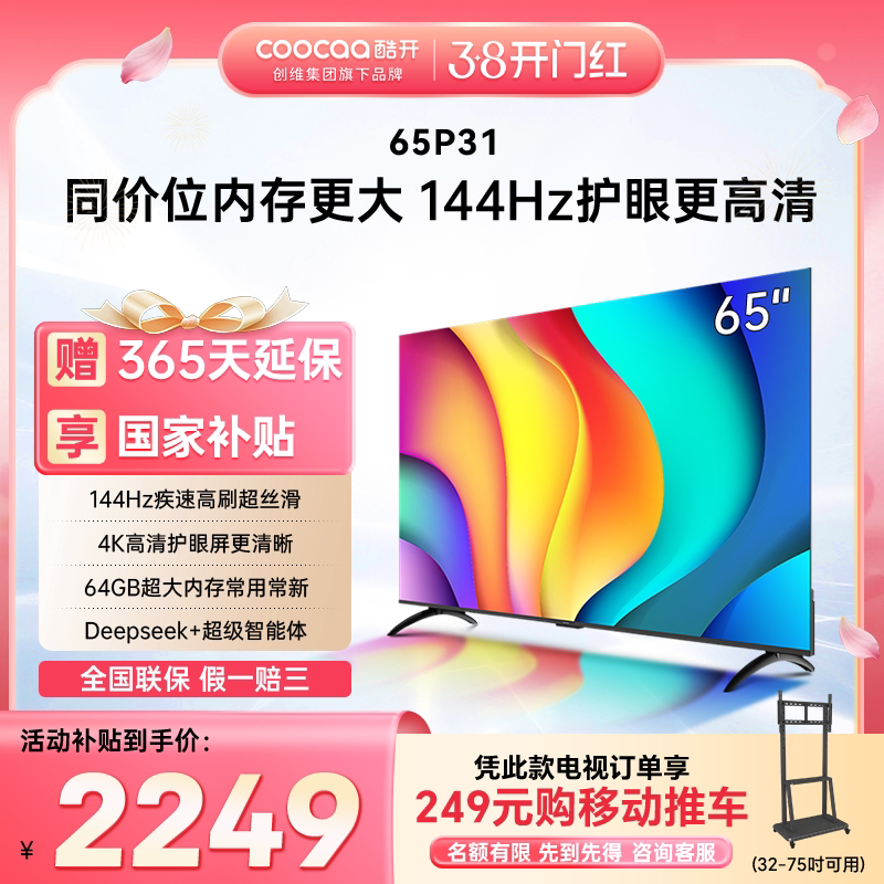 酷开创维65P31 2+64GB 144Hz高刷AI声控 投屏液晶平板电视