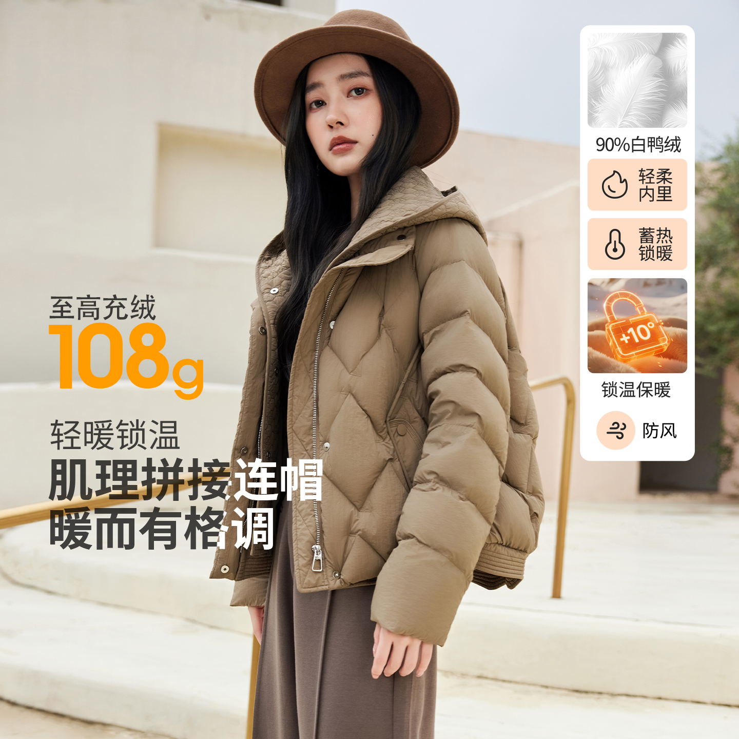 JESSIE量感保暖几何绗线短款鸭绒连帽羽绒服外套女2025年冬季新款