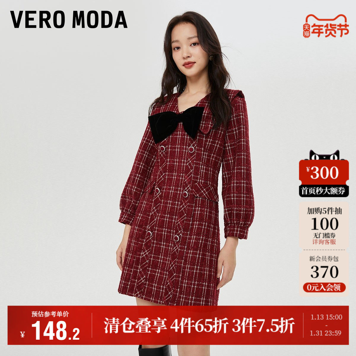 Vero Moda奥莱连衣裙子秋冬清仓小香风花呢优雅气质翻领双排扣女