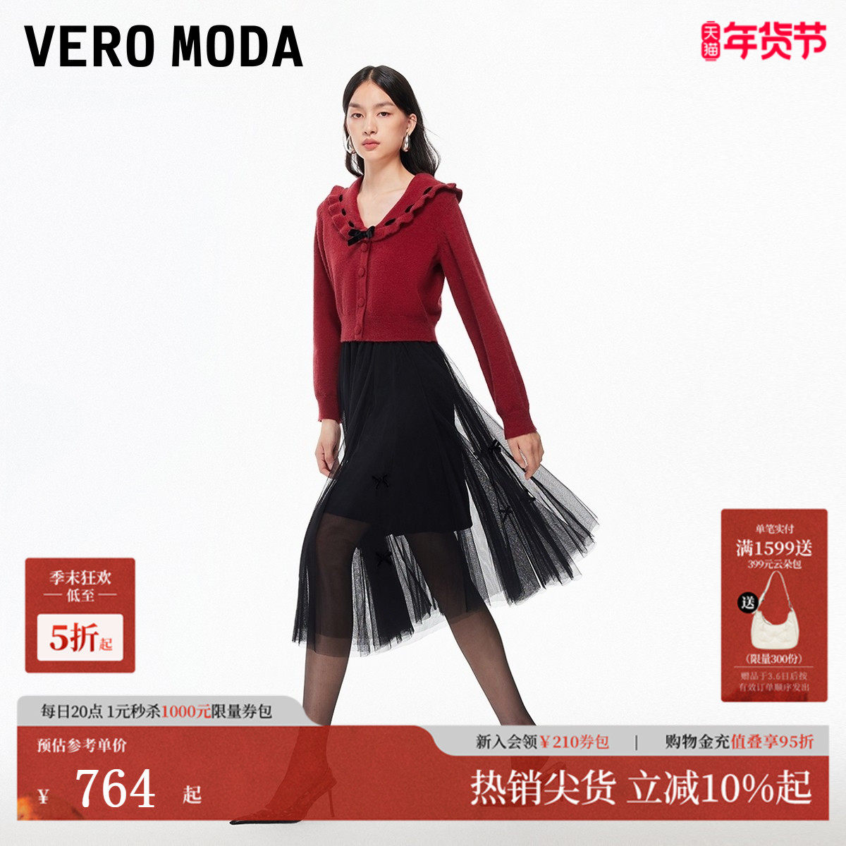 Vero Moda连衣裙2025冬季新款蝴蝶结针织衫红色裙子325446023