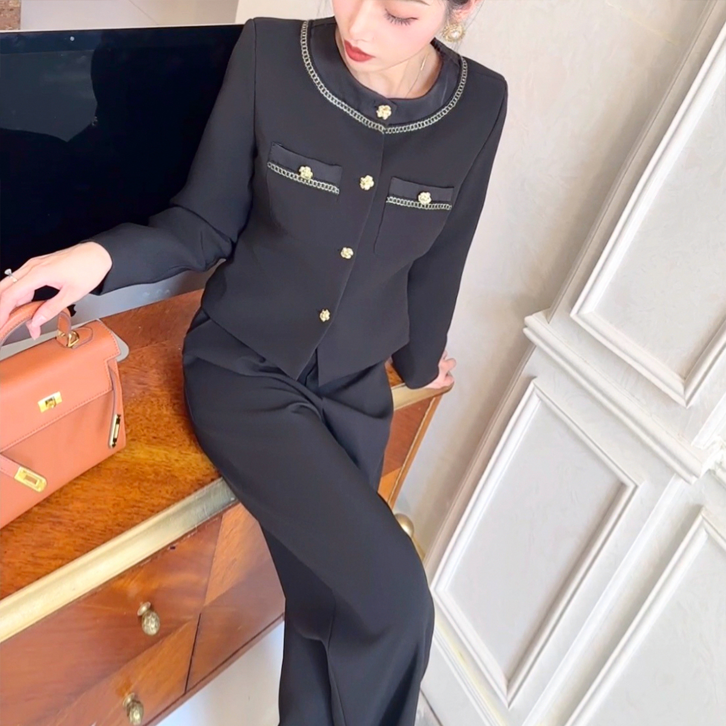 菲梦伊原创小香风时尚套装女秋季气质名媛修身短外套配黑色西装裤