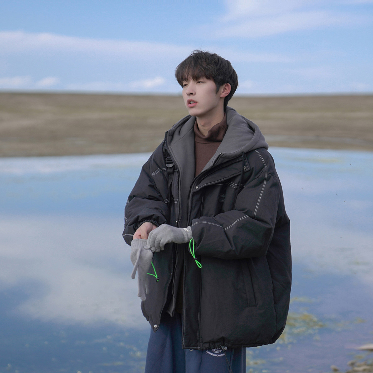 阿于呆STAYFISH日系秋冬连帽假两件棉衣男风衣夹克情侣毛呢外套女