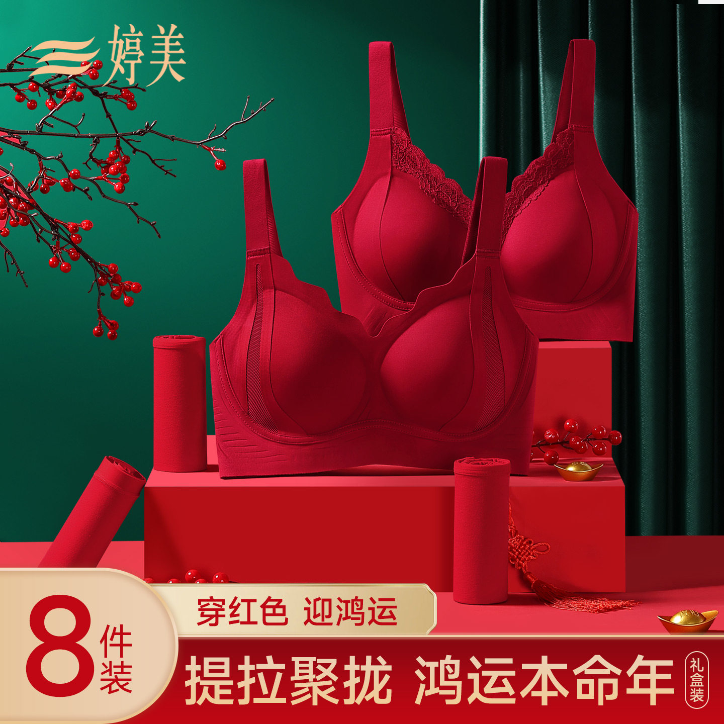 婷美红色内衣本命年套装小胸聚拢2026马年无钢圈收副乳文胸礼盒装
