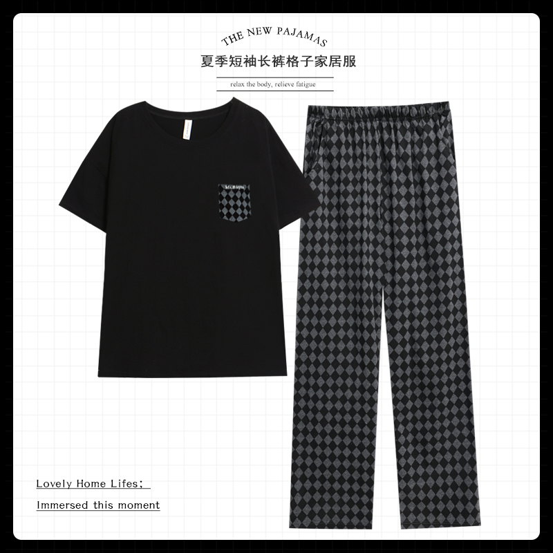 夏季睡衣男士纯棉薄款短袖长裤新款家居服青少年大码宽松格子套装