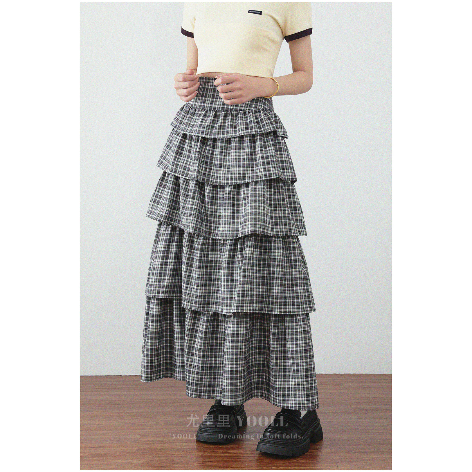 小众复古层次感格子蛋糕裙高腰显瘦A字简约百搭蓬蓬裙甜美半身裙