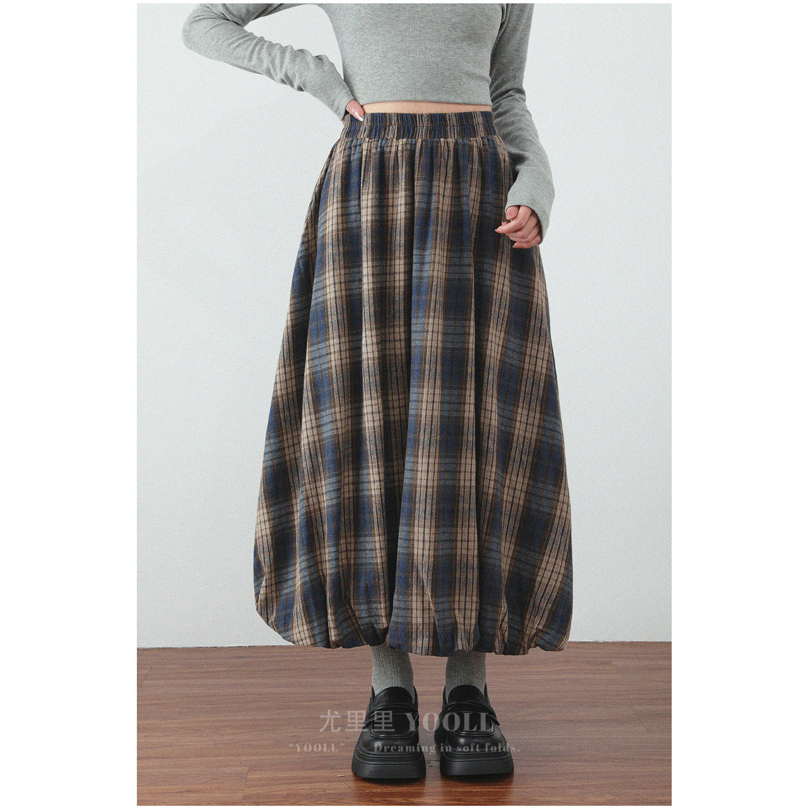 磨毛棉感柔软蓬蓬立体花苞裙春秋新款拼色格纹松紧高腰显瘦半身裙