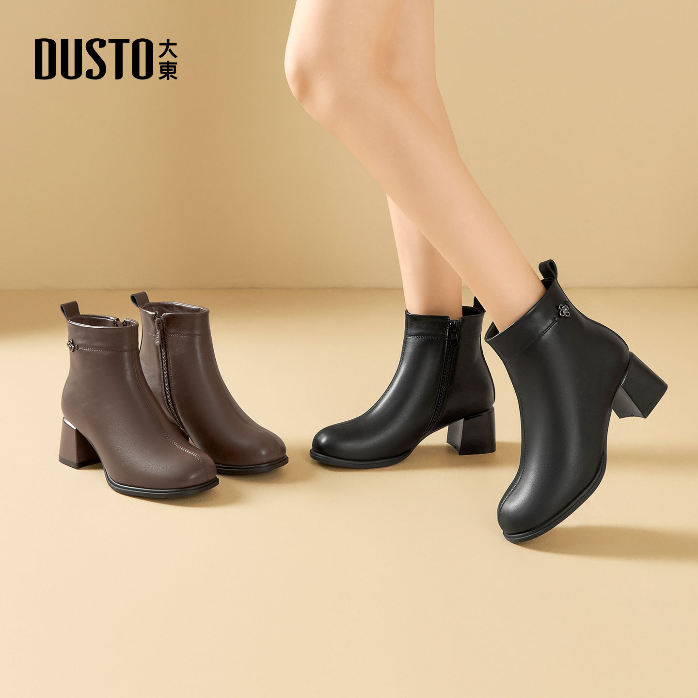 大东女靴2025冬季新款时尚粗跟女短靴高跟方头后拉链加绒保暖女鞋