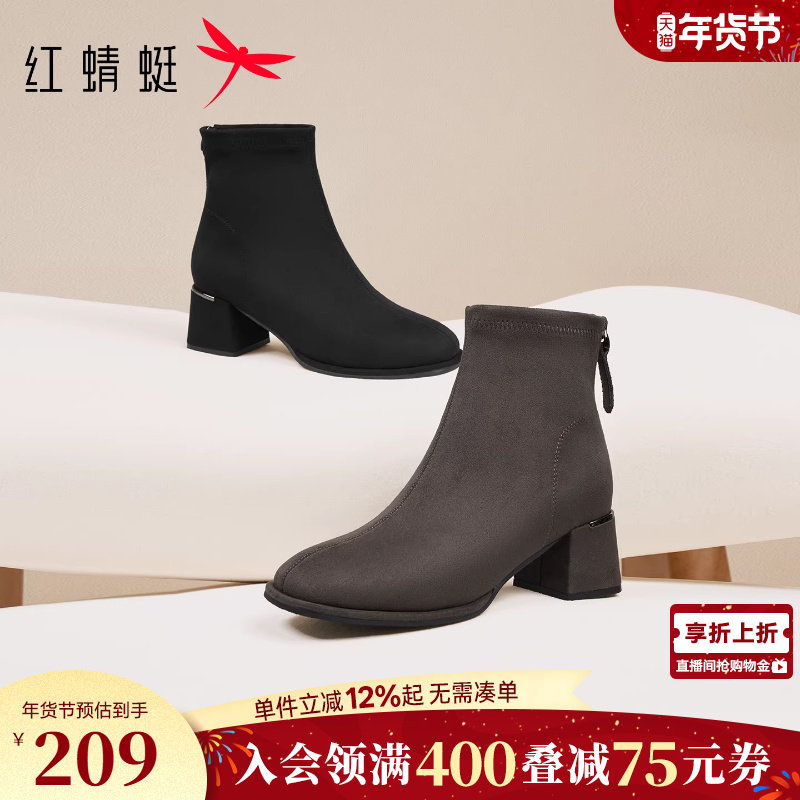 红蜻蜓妈妈靴子冬季新款女鞋靴子粗跟皮鞋女款气质加绒高跟鞋短靴