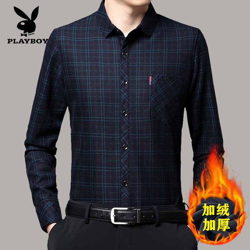 花花公子格子加绒衬衫男冬季保暖纯棉衬衣中年免烫大码内衣爸爸装