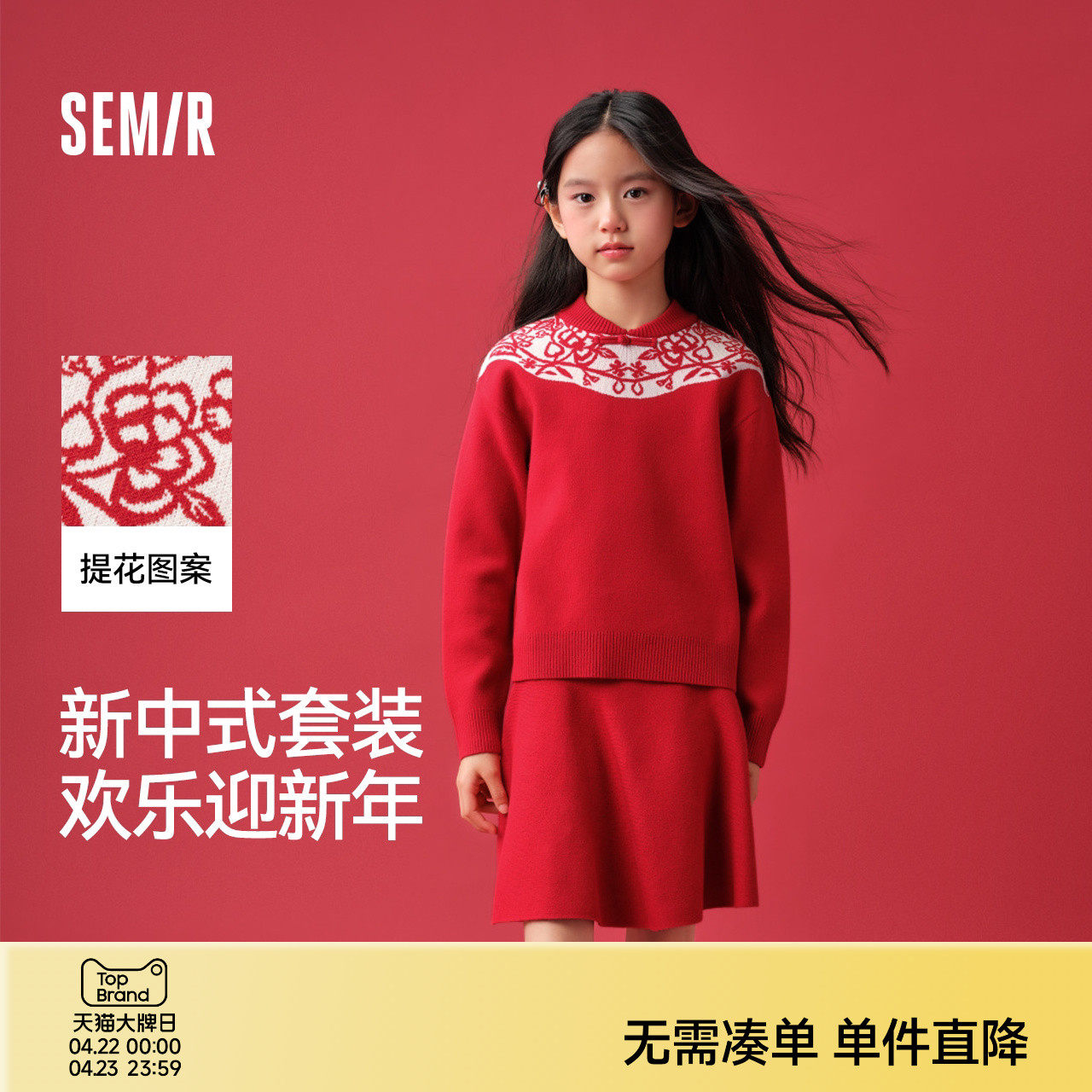 森马儿童套装2025春新款新中式毛衣短裙两件套女童拜年服红色提花